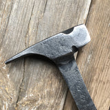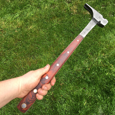Integral claw hammer, meaning the head, and the handle were all forged from one piece of steel. It weighs in at 40 ounces, total weight. Forged from 4140 for toughness, it carries beautifully figured cocobolo hardwood scales. Set with bronze and steel pins to really set it off.